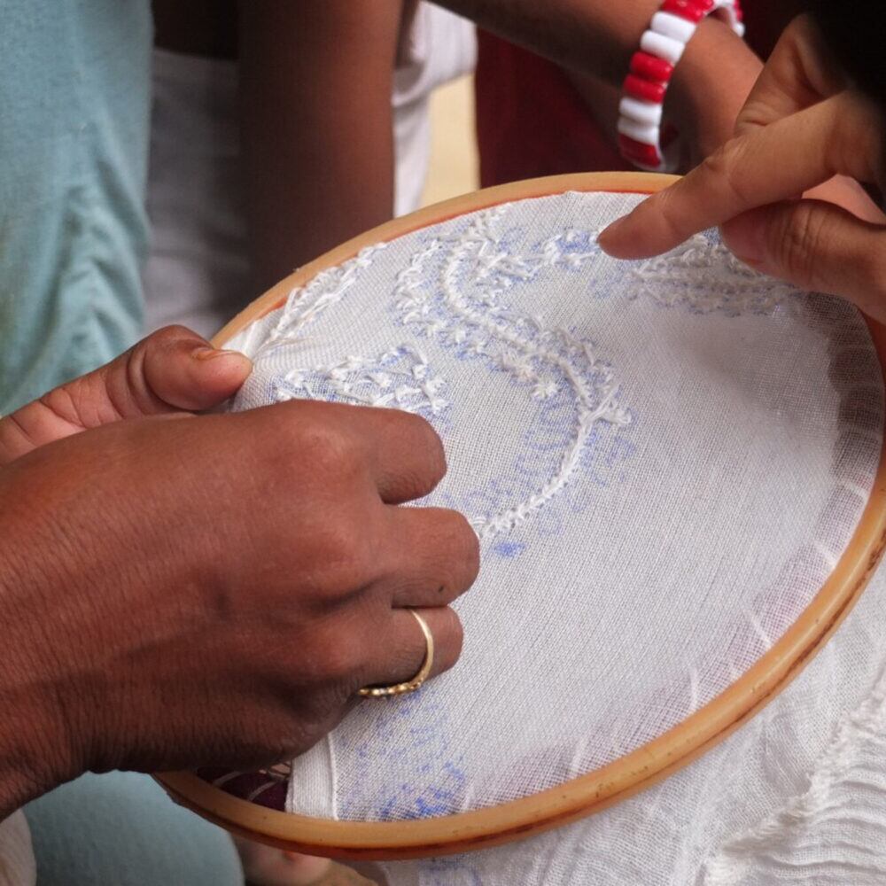 インド伝統のチカン刺繍を、村の女性たちが一針一針丁寧にすすめてくれています。