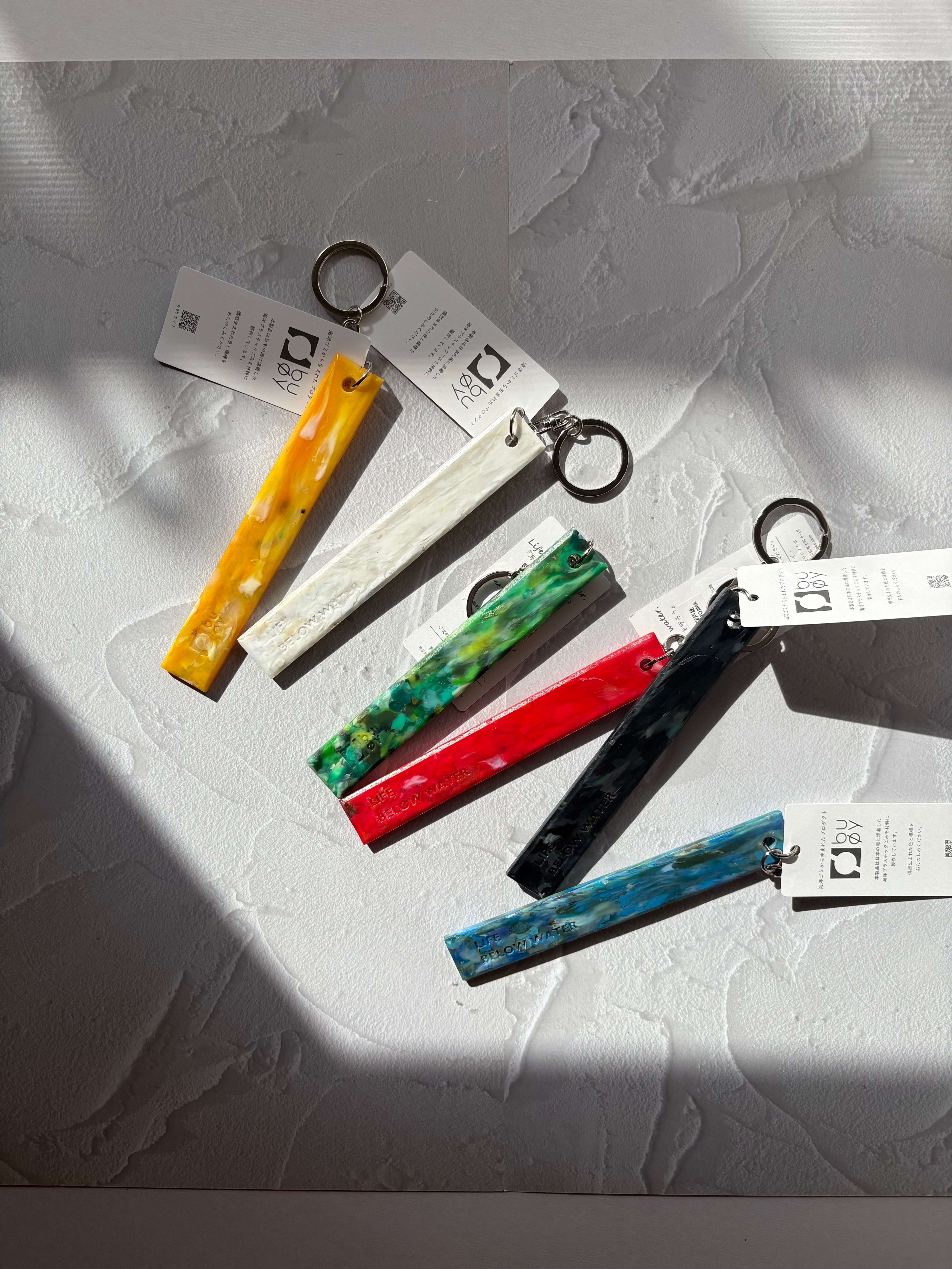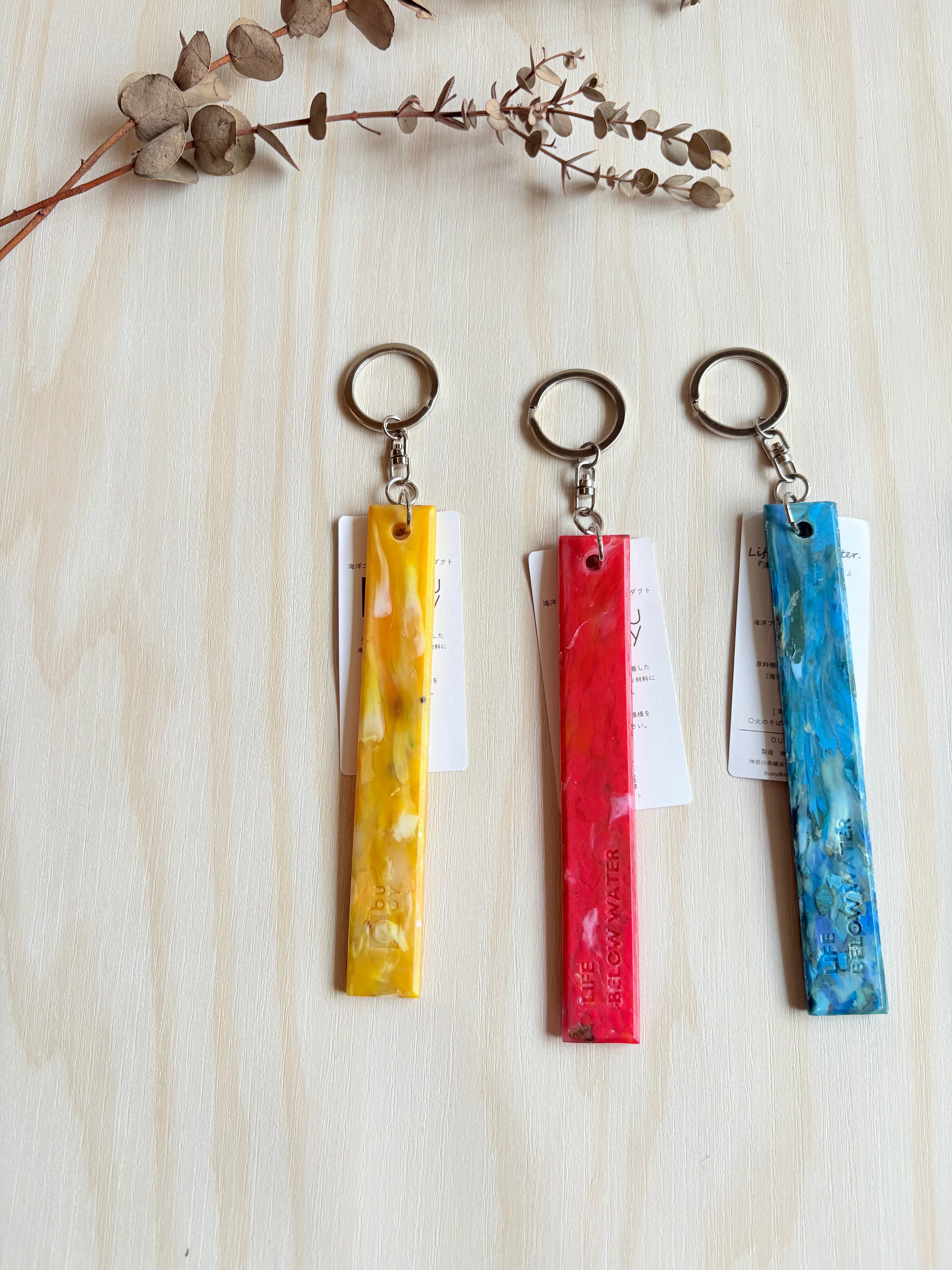 海洋プラスチックをアップサイクルしたキーホルダー。