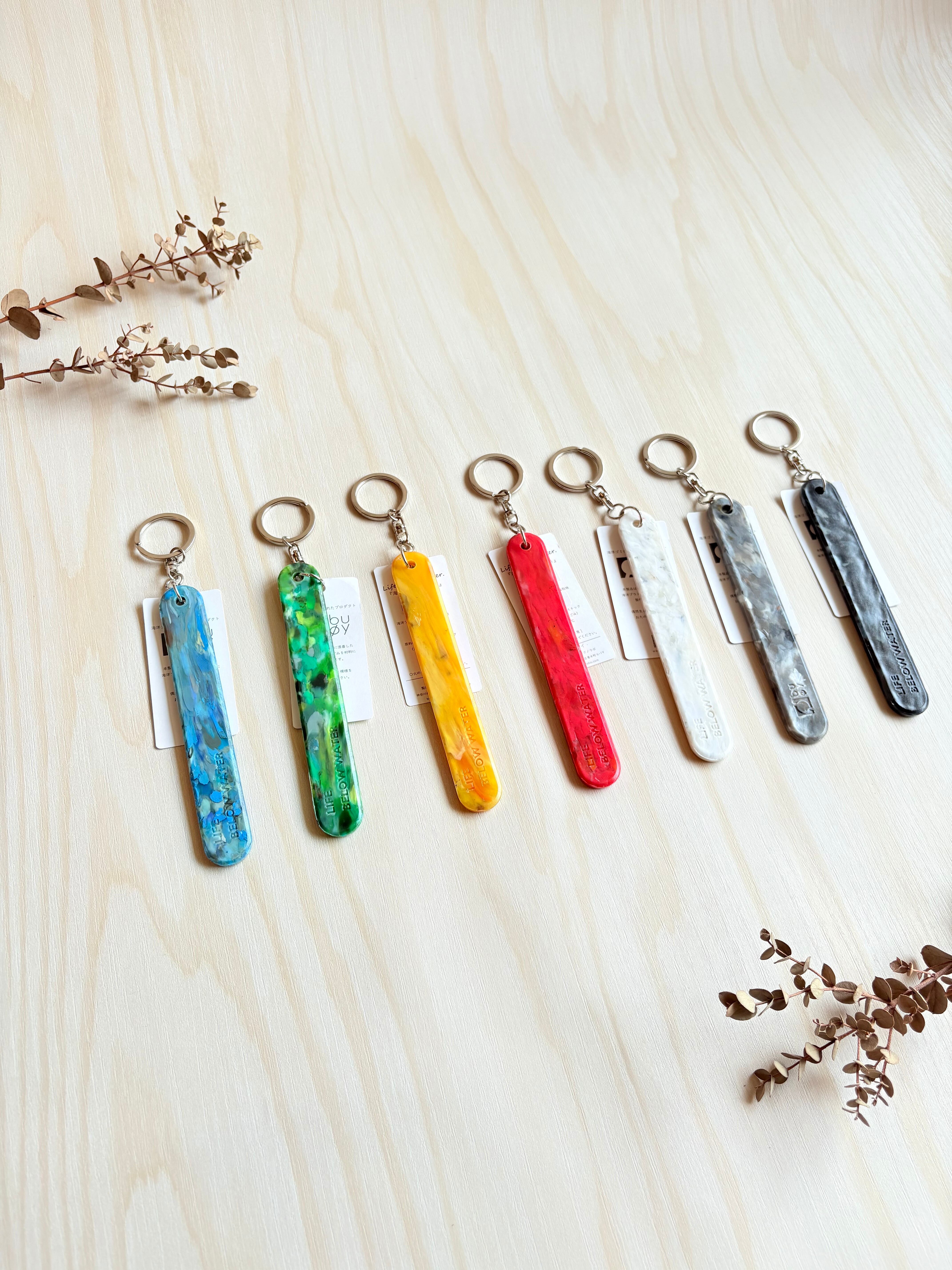 海洋プラスチックゴミをアップサイクルしたキーホルダー。